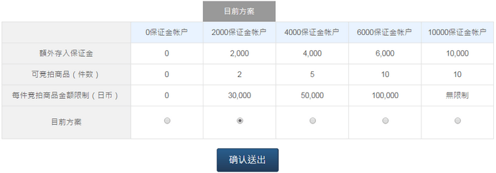特殊保证金帐户分为0元/2000元/4000元/6000元/10000元五个等级,按照等级有竞标权限的不同。举例来说,2000元保证金帐户可以支持两件商品投标,每件商品金额在日円30000以内。