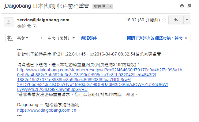 Step 2 登入您的注册电子邮箱,开启密码重置邮件,点击信件上的超链接来进行密码重置。